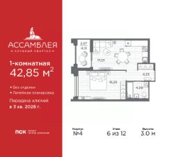 Продается 1-комн. квартира в Клубный квартал "Ассамблея" на 6 этаже. Квартира без отделки, после оформления собственности можно делать ремонт. Общая площадь: 42.85 кв.м., жилая: 15.23 кв.м., площадь просторной кухни-столовой: 17.23 кв.м. Все окна выходят на одну сторону. В квартире одна лоджия, один совмещенный санузел. Высота потолков 3.0 м.