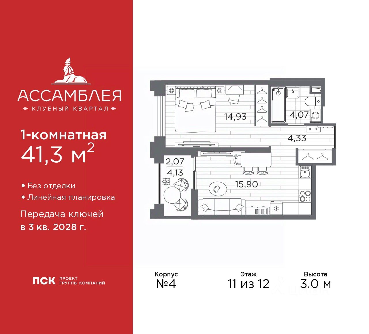 1-комн. квартира от застройщика в Клубный квартал "Ассамблея" на 11 этаже. Квартира без отделки, после выдачи ключей можно делать ремонт. Общая площадь: 41.3 кв.м., жилая: 14.93 кв.м., площадь просторной кухни-столовой: 15.9 кв.м. Все окна выходят на одну сторону. В квартире одна лоджия, один совмещенный санузел. Высота потолков 3.0 м.