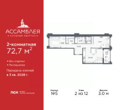 2-комн. квартира в Клубный квартал "Ассамблея" на 2 этаже. Квартира без отделки, после получения ключей можно делать ремонт. Общая площадь: 72.7 кв.м., жилая: 27.27 кв.м., площадь просторной кухни-столовой: 20.5 кв.м. Квартира - распашонка, без проходных комнат, окна выходят на paзные стороны дома. В квартире одна лоджия, один совмещенный и один раздельный санузел. Высота потолков 3.0 м.