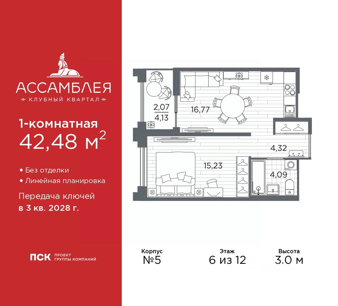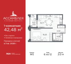 Продается 1-комн. квартира в Клубный квартал "Ассамблея" на 6 этаже. Квартира без отделки, после оформления собственности можно делать ремонт. Общая площадь: 42.48 кв.м., жилая: 15.23 кв.м., площадь просторной кухни-столовой: 16.77 кв.м. Все окна выходят на одну сторону. В квартире одна лоджия, один совмещенный санузел. Высота потолков 3.0 м.