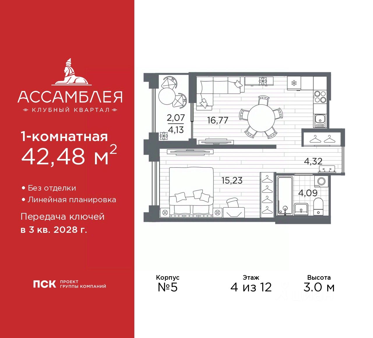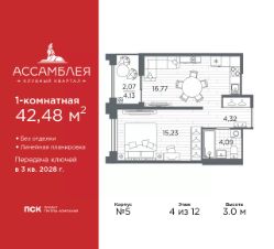 1-комн. квартира от застройщика в Клубный квартал "Ассамблея" на 4 этаже. Квартира без отделки, после оформления собственности можно делать ремонт. Общая площадь: 42.48 кв.м., жилая: 15.23 кв.м., площадь просторной кухни-столовой: 16.77 кв.м. Все окна выходят на одну сторону. В квартире одна лоджия, один совмещенный санузел. Высота потолков 3.0 м.