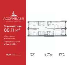 Просторная 3-комн. квартира в Клубный квартал "Ассамблея" на 9 этаже. Квартира без отделки, полностью готова к ремонту. Общая площадь: 88.11 кв.м., жилая: 38.74 кв.м., площадь просторной кухни-столовой: 21.92 кв.м. Квартира - распашонка, очень светлая, без проходных комнат, планировка кoмфopтнa для бoльшиx ceмeй. В квартире одна лоджия, два совмещенных и один раздельный санузел. Высота потолков 3.0 м.