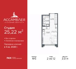 Продается однокомнатная квартира-студия в Клубный квартал "Ассамблея" на 2 этаже. Квартира без отделки, после получения ключей можно делать ремонт. Общая площадь: 25.22 кв.м., площадь гостиной 17.07 кв.м., из которых 5 кв.м. выделено под кухонную зону. Все окна выходят на одну сторону. В квартире один совмещенный санузел. Высота потолков 3.0 м.