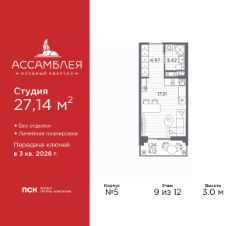 Продается 1-комн. квартира-студия в Клубный квартал "Ассамблея" на 9 этаже. Квартира без отделки, полностью готова к чистовой отделке и дальнейшему ремонту. Общая площадь: 27.14 кв.м., площадь гостиной 17.51 кв.м., из которых 5 кв.м. выделено под кухонную зону. Все окна выходят на одну сторону. В квартире один балкон, один совмещенный санузел. Высота потолков 3.0 м.