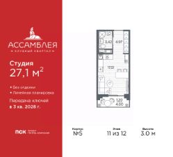 Просторная 1-комн. квартира-студия в Клубный квартал "Ассамблея" на 11 этаже. Квартира без отделки, новый владелец может сделать ремонт по своему проекту. Общая площадь: 27.1 кв.м., площадь гостиной 17.51 кв.м., из которых 5 кв.м. выделено под кухонную зону. Все окна выходят на одну сторону. В квартире один балкон, один совмещенный санузел. Высота потолков 3.0 м.