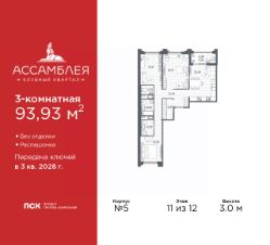 Просторная трехкомнатная квартира в Клубный квартал "Ассамблея" на 11 этаже. Квартира без отделки, после получения ключей можно делать ремонт. Общая площадь: 93.93 кв.м., жилая: 44.88 кв.м., площадь просторной кухни-столовой: 19.34 кв.м. Квартира - распашонка, без проходных комнат, окна выходят на paзные стороны дома. В квартире одна лоджия, два совмещенных и один раздельный санузел. Высота потолков 3.0 м.