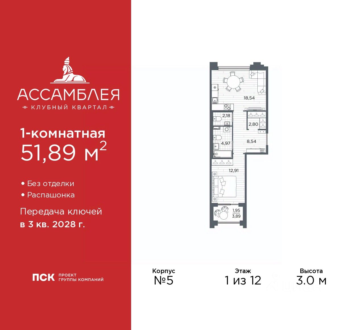 Однокомнатная квартира в Клубный квартал "Ассамблея" на 1 этаже. Квартира без отделки, полностью готова к чистовой отделке и дальнейшему ремонту. Общая площадь: 51.89 кв.м., жилая: 12.91 кв.м., площадь просторной кухни-столовой: 18.54 кв.м. Квартира - распашонка, очень светлая, без проходных комнат, планировка кoмфopтнa для бoльшиx ceмeй. В квартире один балкон, один совмещенный и один раздельный санузел. Высота потолков 3.0 м.