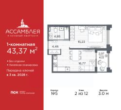 Однокомнатная квартира в Клубный квартал "Ассамблея" на 2 этаже. Квартира без отделки, после выдачи ключей можно делать ремонт. Общая площадь: 43.37 кв.м., жилая: 15.23 кв.м., площадь просторной кухни-столовой: 16.77 кв.м. Все окна выходят на одну сторону. В квартире одна лоджия, один совмещенный санузел. Высота потолков 3.0 м.