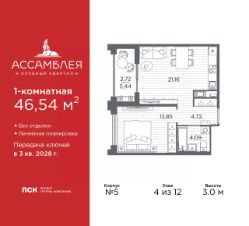 Просторная 1-комн. квартира в Клубный квартал "Ассамблея" на 4 этаже. Квартира без отделки, полностью готова к ремонту. Общая площадь: 46.54 кв.м., жилая: 13.85 кв.м., площадь просторной кухни-столовой: 21.16 кв.м. Все окна выходят на одну сторону. В квартире одна лоджия, один совмещенный санузел. Высота потолков 3.0 м.