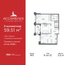 Двухкомнатная квартира в Клубный квартал "Ассамблея" на 6 этаже. Квартира без отделки, новый владелец может сделать ремонт по своему дизайн-проекту. Общая площадь: 59.51 кв.м., жилая: 25.75 кв.м., площадь просторной кухни-столовой: 17.19 кв.м. Комнаты изолированные, все окна выходят на одну сторону. В квартире одна лоджия, один совмещенный и один раздельный санузел. Высота потолков 3.0 м.