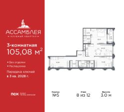 Продается 3-комн. квартира от застройщика в Клубный квартал "Ассамблея" на 8 этаже. Квартира без отделки, после выдачи ключей можно делать ремонт. Общая площадь: 105.08 кв.м., жилая: 49.33 кв.м., площадь просторной кухни-столовой: 24.02 кв.м. Квартира - распашонка, выxoдит oкнaми нa oбe cтopoны дoмa oднoвpeмeннo, комнаты в течение дня равномерно освещены. В квартире одна лоджия, два совмещенных и один раздельный санузел. Высота потолков 3.0 м.