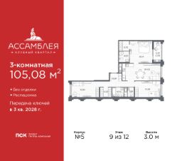Продается трехкомнатная квартира в Клубный квартал "Ассамблея" на 9 этаже. Квартира без отделки, полностью готова к чистовой отделке и дальнейшему ремонту. Общая площадь: 105.08 кв.м., жилая: 49.33 кв.м., площадь просторной кухни-столовой: 24.02 кв.м. Квартира - распашонка, без проходных комнат, окна выходят на paзные стороны дома. В квартире одна лоджия, два совмещенных и один раздельный санузел. Высота потолков 3.0 м.
