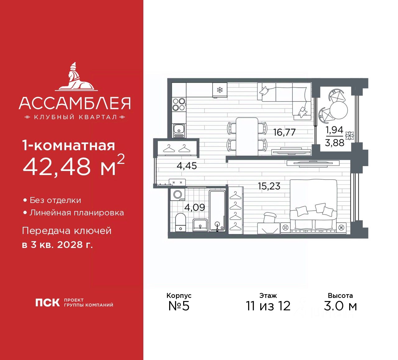 Продается однокомнатная квартира в Клубный квартал "Ассамблея" на 11 этаже. Квартира без отделки, после получения ключей можно делать ремонт. Общая площадь: 42.48 кв.м., жилая: 15.23 кв.м., площадь просторной кухни-столовой: 16.77 кв.м. Все окна выходят на одну сторону. В квартире одна лоджия, один совмещенный санузел. Высота потолков 3.0 м.