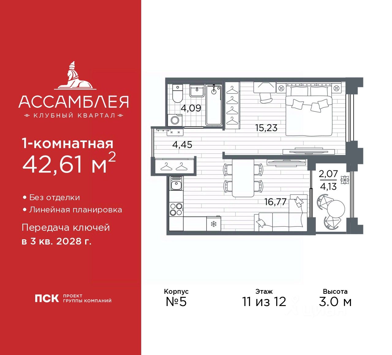 Продается 1-комн. квартира от застройщика в Клубный квартал "Ассамблея" на 11 этаже. Квартира без отделки, полностью готова к чистовой отделке и дальнейшему ремонту. Общая площадь: 42.61 кв.м., жилая: 15.23 кв.м., площадь просторной кухни-столовой: 16.77 кв.м. Все окна выходят на одну сторону. В квартире одна лоджия, один совмещенный санузел. Высота потолков 3.0 м.
