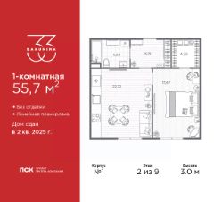 1-комн. квартира от застройщика в ЖК "BAKUNINA 33" на 2 этаже. Квартира без отделки, после оформления собственности можно делать ремонт. Общая площадь: 55.7 кв.м., жилая: 17.67 кв.м., площадь просторной кухни-столовой: 22.72 кв.м. Все окна выходят на одну сторону. В квартире один совмещенный санузел. Высота потолков 3.0 м.