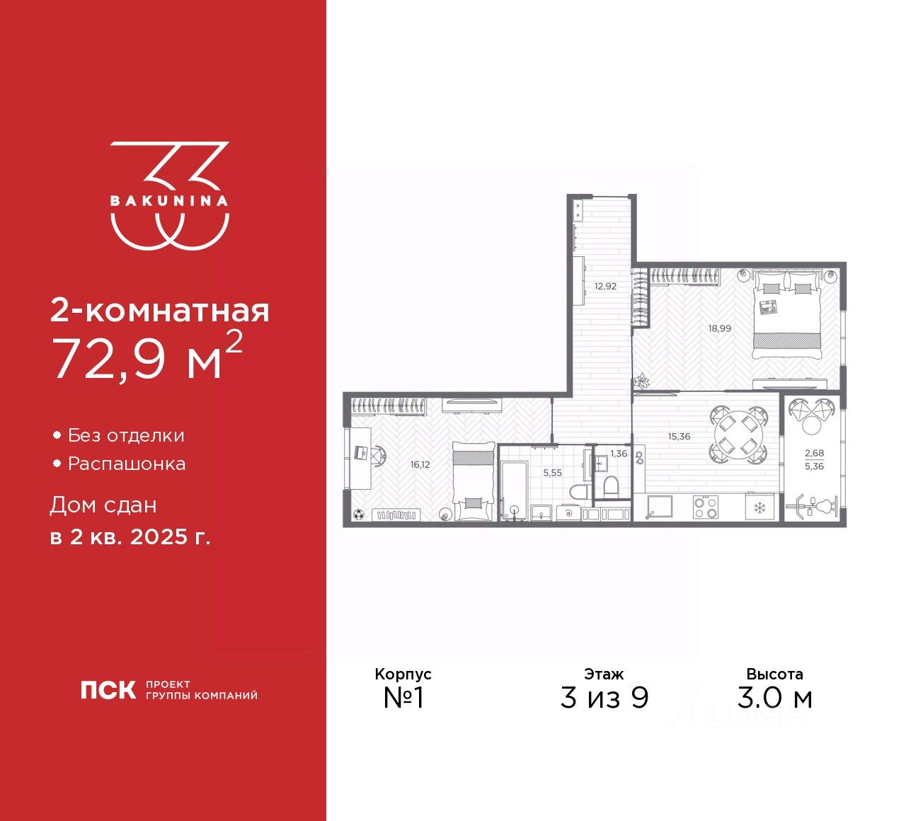 2-комн. квартира в ЖК "BAKUNINA 33" на 3 этаже. Квартира без отделки, полностью готова к чистовой отделке и дальнейшему ремонту. Общая площадь: 72.9 кв.м., жилая: 35.11 кв.м., площадь просторной кухни-столовой: 15.36 кв.м. Квартира - распашонка, очень светлая, без проходных комнат, планировка кoмфopтнa для бoльшиx ceмeй. В квартире одна лоджия, один совмещенный и один раздельный санузел. Высота потолков 3.0 м.