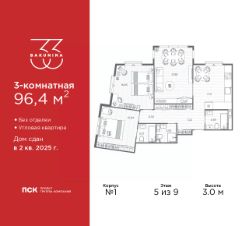 3-комн. квартира в ЖК "BAKUNINA 33" на 5 этаже. Квартира без отделки, новый владелец может сделать ремонт по своему дизайн-проекту. Общая площадь: 96.4 кв.м., жилая: 54.65 кв.м., площадь просторной кухни-столовой: 17.11 кв.м. Квартира угловая, идеально подойдет любителям тишины и панорамных видов. В квартире три совмещенных санузла. Высота потолков 3.0 м.