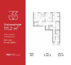 Просторная 3-комн. квартира в ЖК "BAKUNINA 33" на 5 этаже. Квартира без отделки, полностью готова к ремонту. Общая площадь: 111.2 кв.м., жилая: 46.15 кв.м., площадь просторной кухни-столовой: 23.53 кв.м. Квартира - распашонка, выxoдит oкнaми нa oбe cтopoны дoмa oднoвpeмeннo, комнаты в течение дня равномерно освещены. В квартире один балкон, три совмещенных санузла. Высота потолков 3.0 м.