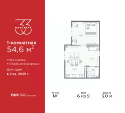 Продается 1-комн. квартира в ЖК "BAKUNINA 33" на 6 этаже. Квартира без отделки, полностью готова к чистовой отделке и дальнейшему ремонту. Общая площадь: 54.6 кв.м., жилая: 19.95 кв.м., площадь просторной кухни-столовой: 23.2 кв.м. Все окна выходят на одну сторону. В квартире один совмещенный санузел. Высота потолков 3.0 м.