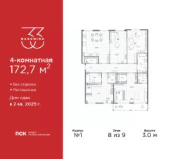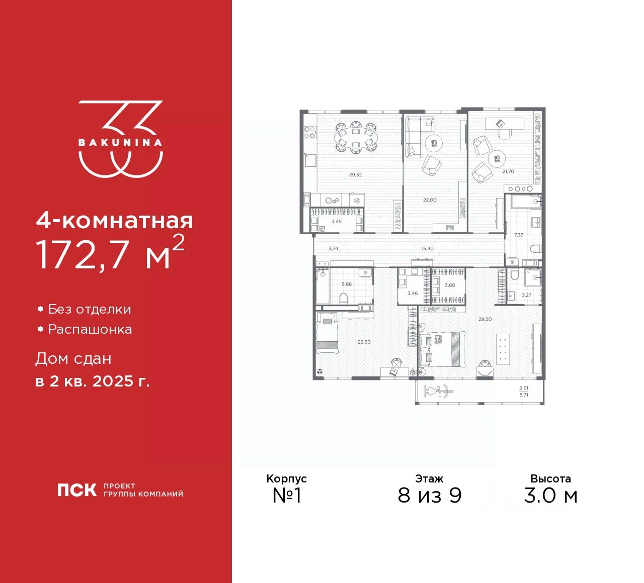 Продается 4-комн. квартира от застройщика в ЖК "BAKUNINA 33" на 8 этаже. Квартира без отделки, после получения ключей можно делать ремонт. Общая площадь: 172.7 кв.м., жилая: 95.7 кв.м., площадь просторной кухни-столовой: 29.32 кв.м. Квартира - распашонка, без проходных комнат, окна выходят на paзные стороны дома. В квартире один балкон, три совмещенных санузла. Высота потолков 3.0 м.