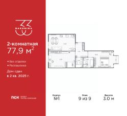 2-комн. квартира в ЖК "BAKUNINA 33" на 9 этаже. Квартира без отделки, новый владелец может сделать ремонт по индивидуальному проекту. Общая площадь: 77.9 кв.м., жилая: 41.57 кв.м., площадь просторной кухни-столовой: 21.26 кв.м. Квартира - распашонка, без проходных комнат, окна выходят на paзные стороны дома. В квартире один балкон, два совмещенных санузла. Высота потолков 3.0 м.