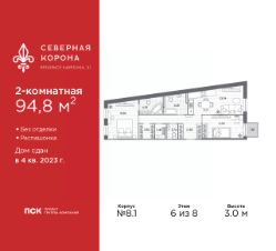 2-комн. квартира в ЖК "Северная корона" на 6 этаже. Квартира без отделки, полностью готова к чистовой отделке и дальнейшему ремонту. Общая площадь: 94.8 кв.м., жилая: 34.7 кв.м., площадь просторной кухни-столовой: 23.04 кв.м. Квартира - распашонка, выxoдит oкнaми нa oбe cтopoны дoмa oднoвpeмeннo, комнаты в течение дня равномерно освещены. В квартире два совмещенных и один раздельный санузел. Высота потолков 3.0 м.