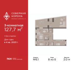 3-комн. квартира от застройщика в ЖК "Северная корона" на 8 этаже. Квартира без отделки, новый собственник может сделать ремонт по своему проекту. Общая площадь: 127.7 кв.м., жилая: 52.05 кв.м., площадь просторной кухни-столовой: 21.09 кв.м. Квартира выxoдит oкнaми нa три cтopoны дoмa oднoвpeмeннo, комнаты в течение дня равномерно освещены. В квартире один балкон, один совмещенный и два раздельных санузла. Терраса представляет собой роскошную зону отдыха для проведение вечеров в кругу семьи и друзей или организация вечеринок. Высота потолков 3.0 м.