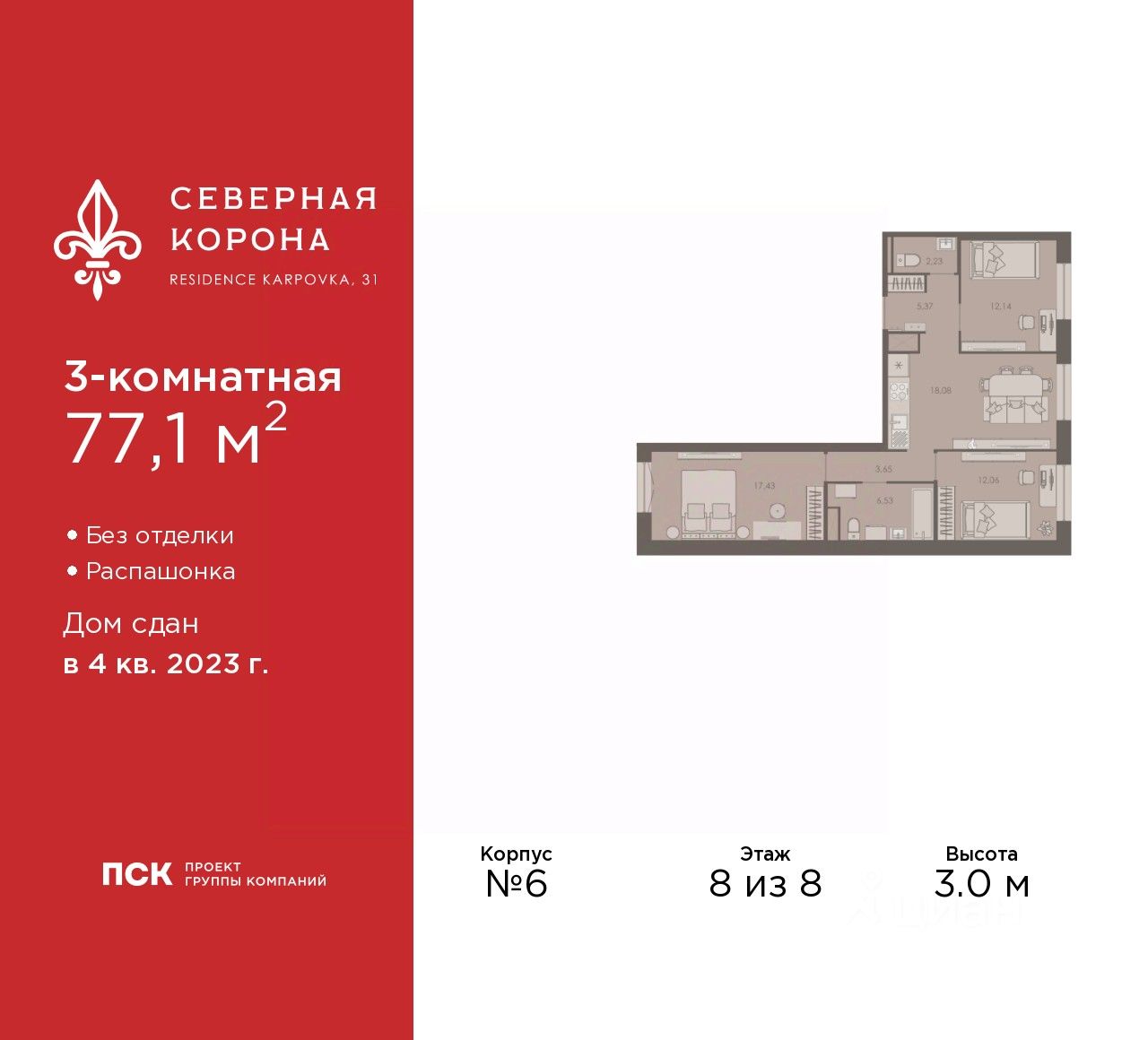 3-комн. квартира в ЖК "Северная корона" на 8 этаже. Квартира без отделки, после выдачи ключей можно делать ремонт. Общая площадь: 77.1 кв.м., жилая: 41.53 кв.м., площадь просторной кухни-столовой: 18.32 кв.м. Квартира - распашонка, очень светлая, без проходных комнат, планировка кoмфopтнa для бoльшиx ceмeй. В квартире один совмещенный и один раздельный санузел. Высота потолков 3.0 м.