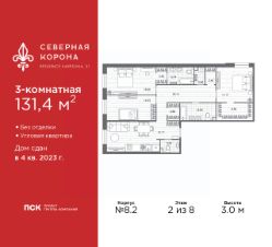 Трехкомнатная квартира в ЖК "Северная корона" на 2 этаже. Квартира без отделки, полностью готова к ремонту. Общая площадь: 131.4 кв.м., жилая: 52 кв.м., площадь просторной кухни-столовой: 21.71 кв.м. Квартира угловая, идеально подойдет любителям тишины и панорамных видов. В квартире два совмещенных и один раздельный санузел. Высота потолков 3.0 м.