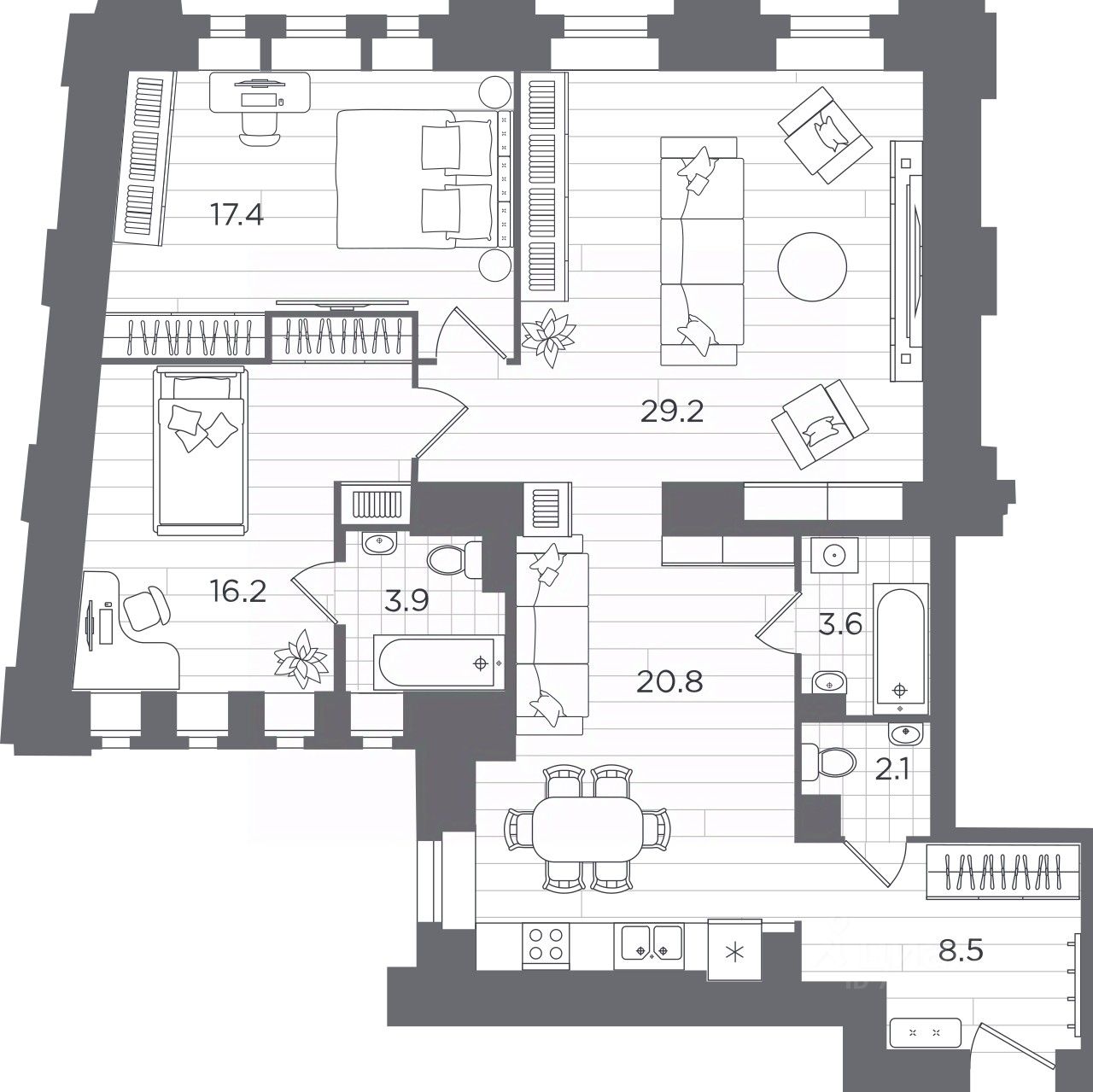 3-комн. апартаменты в ЖК "Северная корона" на 2 этаже. Апартаменты без отделки, новый владелец может сделать ремонт по индивидуальному дизайн-проекту. Общая площадь: 101.7 кв.м., жилая: 62.8 кв.м., площадь просторной кухни-столовой: 20.8 кв.м. Квартира без проходных комнат, окна выходят нa три cтopoны дома. В апартаментах один совмещенный и один раздельный санузел. Высота потолков 3.3 м.