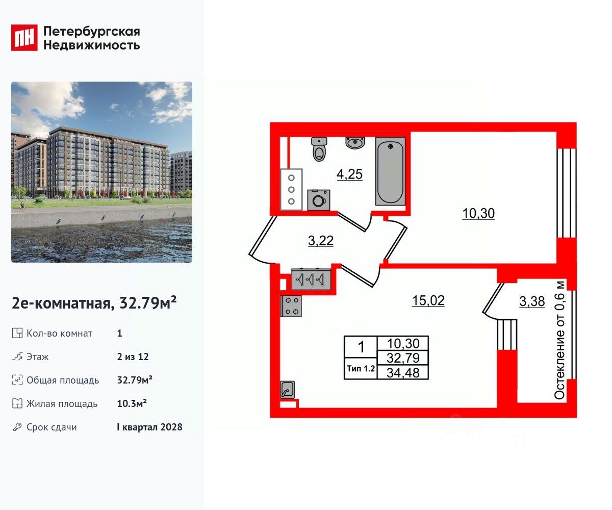 Удобная, классическая, функциональная европланировка, большая кухня-гостиная 15.02 м², вместительная прихожая 3.22 м². Общая площадь квартиры - 32.79 м², жилая 10.3 м², высота потолка 2.77 м.