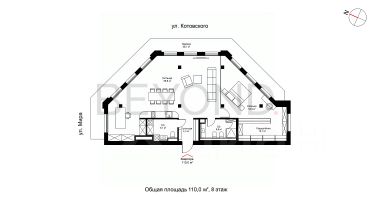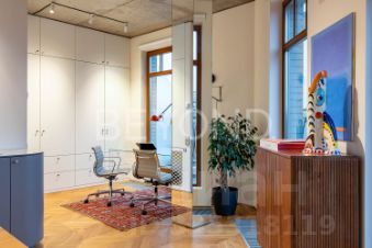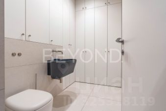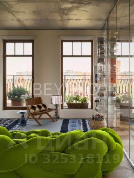 Одиннадцать панорамных окон наполняют пространство светом; высокие потолки, деревянные двухкамерные стеклопакеты и пол из массива задают ощущение спокойной, дорогой среды. Кухня-столовая, гостиная, спальня, кабинет, просторная гардеробная с макияжным столиком, мастер-санузел, постирочная и прихожая — каждый метр продуман именитым дизайнером.