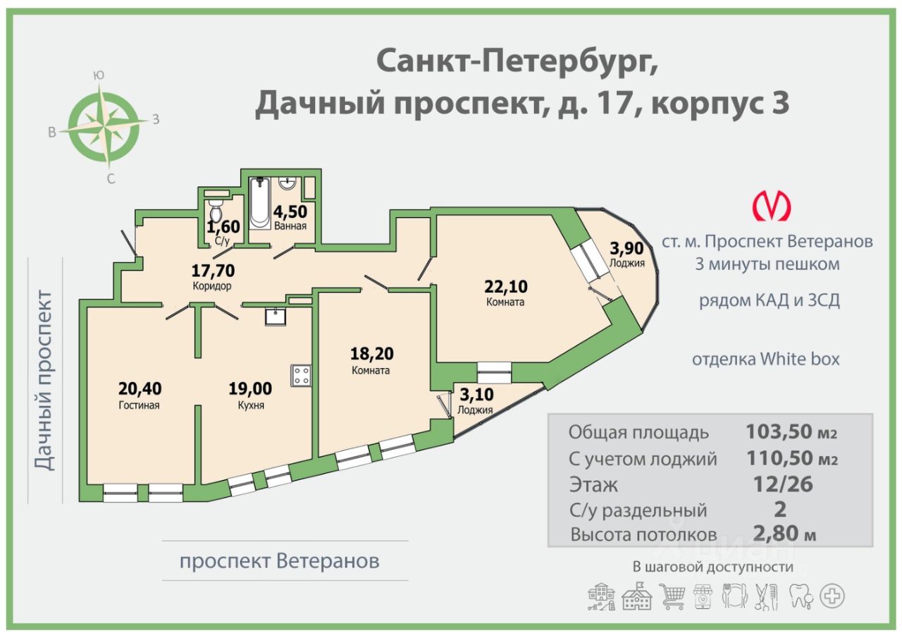 ЭКСКЛЮЗИВ. КВАРТИРА, КОТОРЫЕ ПОКУПАЮТ БЕЗ РАЗДУМИЙ Евро-4 комнатная квартира в кирпичном доме 2 минуты пешком до станции метро Пр-т Ветеранов Дачный пр., 17 к.3 Высокий этаж | Панорамный вид | Тихий зелёный двор без машин ________________________________________ РЕДКИЙ ФОРМАТ, КОТОРЫЙ БОЛЬШЕ НЕ СТРОЯТ 110,5 м² свободы для жизни, семьи и приватности Это не просто большая квартира. Это пространство, где каждая деталь работает на комфорт и статус. Просторная кухня-гостиная — центр семейной жизни 3 полноценные спальни — у каждого своя территория Потолки 2,8 м — воздух, свет, ощущение объёма Окна на две стороны — всегда светло 2 лоджии с обзорным видом Раздельный санузел 3 гардеробные ниши под встроенные шкафы Планировка легко трансформируется в идеальный формат Евро-4 — без компромиссов. ________________________________________ СОСТОЯНИЕ WHITE BOX — ВЫ НЕ ПЛАТИТЕ ЗА ЧУЖИЕ ОШИБКИ Никаких демонтажей, кривых стен и ремонта под снос. Вы: — не переплачиваете — не переделываете — создаёте интерьер под себя с нуля Кирпичные стены, правильная геометрия, железобетонные перекрытия — идеальная база для дорогого и продуманного проекта. ________________________________________ О ДОМЕ (ТО, ЧТО РЕАЛЬНО ВАЖНО) Дом 2006 года, кирпич-монолит Консьерж, видеонаблюдение 24/7 2 пассажирских + грузовой лифт Подземный паркинг Тихо. Зелено. Без транзитных машин. Такие дома ценятся годами и не теряют в ликвидности. ________________________________________ ЛОКАЦИЯ, КОТОРУЮ НЕ НУЖНО ОБЪЯСНЯТЬ 2 минуты пешком до метро Быстрый выезд на КАД и ЗСД, до центра Санкт-Петербурга 15 минут на машине Всё для жизни — в пешей доступности: — школы и детские сады — магазины, кафе, рестораны, пекарни — поликлиники, аптеки — крупные ТРК — Зеленые зоны для прогулок: Воронцовский и Шереметьевский сквер, Парк Александрино Идеально для семьи, которая ценит время. ________________________________________ ПО СДЕЛКЕ — ЧИСТО И ПРОЗРАЧНО Первый и единственный собственник (покупка у застройщика) Без обременений Маткапитал не использовался Вся сумма в договоре Прямая продажа Быстрый выход на сделку Полное юридическое сопровождение ________________________________________ ВАЖНО Такие квартиры не висят в рекламе месяцами. Их либо покупают сразу — либо потом о них жалеют. Это предложение для тех, кто умеет принимать решения и не упускает возможности. Звоните. Показы в любое удобное время.