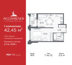 Однокомнатная квартира в Клубный квартал "Ассамблея" на 7 этаже. Квартира без отделки, новый владелец может сделать ремонт по индивидуальному дизайн-проекту. Общая площадь: 42.45 кв.м., жилая: 15.23 кв.м., площадь просторной кухни-столовой: 16.74 кв.м. Все окна выходят на одну сторону. В квартире одна лоджия, один совмещенный санузел. Высота потолков 3.0 м.