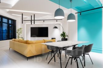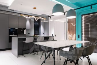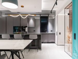 Просторная кухня-гостиная 47 м2, является настоящим бриллиантом этой квартиры и приятно погружает в атмосферу уюта: детский смех, манящий запах запеченной утки, которую только вытащили из духовки. Вся семья собралась на праздничный ужин и в доме царит атмосфера тепла. Также установлен телевизор Samsung 85" c акустикой и ощущением домашнего кинотеатра.
