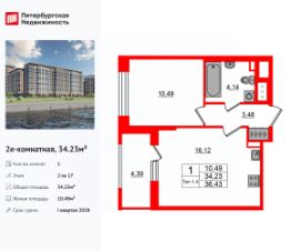 Удобная, классическая, функциональная европланировка, большая кухня-гостиная 16.12 м², вместительная прихожая 3.48 м². Общая площадь квартиры - 34.23 м², жилая 10.49 м², высота потолка 2.77 м.