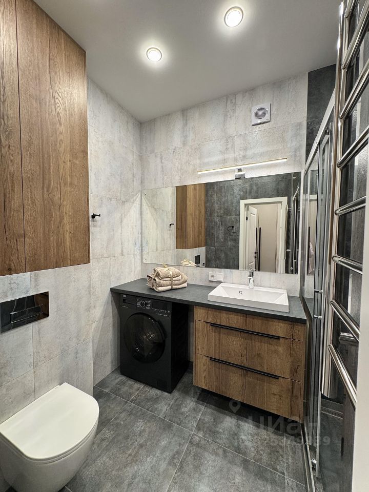 Дизайнерская ванная комната с душевой стеклянной кабиной, стиральной машиной, туалетным шкафом - раковиной.
