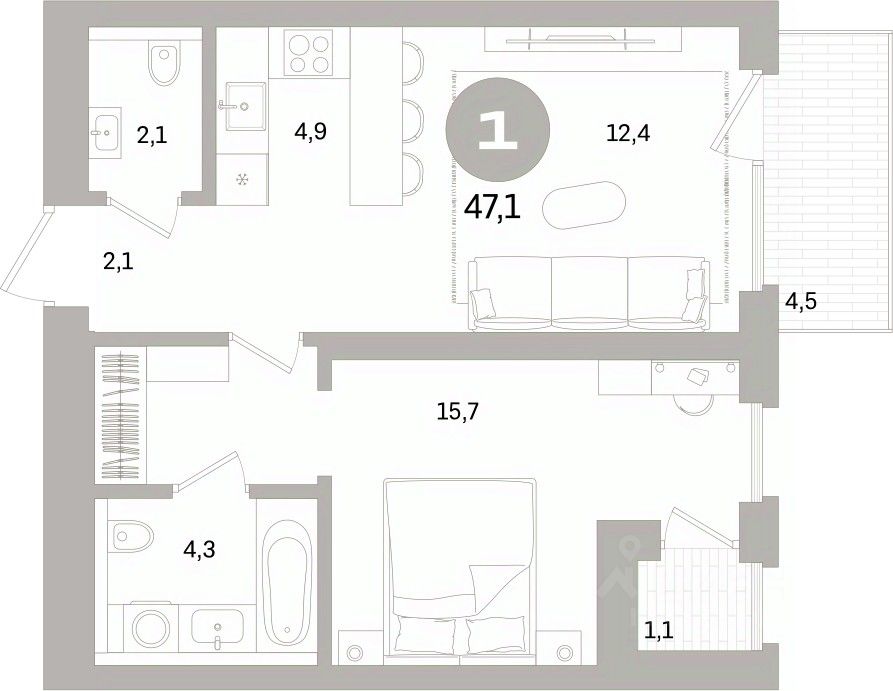 Продается однокомнатная квартира с предчистовой отделкой в ЖК "Северный ветер" на 3 этаже. Общая площадь: 47.12 кв.м., жилая: 15.7 кв.м., площадь просторной кухни-столовой: 17.3 кв.м. Все окна выходят на одну сторону. В квартире один балкон, один совмещенный санузел. Высота потолков 3.1 м.