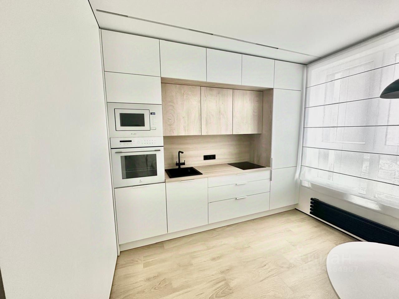 Кухня со встроенной бытовой техникой (холодильник, микроволновая печь, варочная панель, духовка и посудомоечная машина). Мойка, смесители Omoikiri.