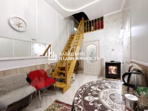 Комнат с лестницей, которая ведет на 2 этаж и печью.