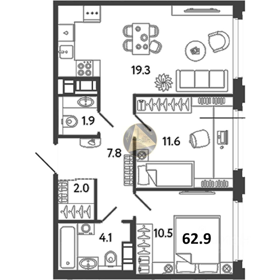 Квартира находится на 5/13 этаже. Общая площадь квартиры 62.9 м2.