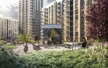 4. На всей территории действует Wi-Fi, входные группы с витражным остеклением и потолками 3,3 м, а также лифты с выходом на уровень подземного паркинга. В холлах — арт-объекты, уличная библиотека, места для встреч.