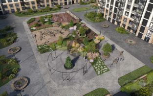 3. Двор разделен на 2 зоны — для уединенного отдыха и для активного общения. Благоустройство включает игровые и спортивные площадки, пешеходные мостики, навесы, беседки, зону с музыкальным терменвоксом и клуб с коворкингом.