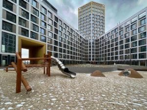 Недалеко от дома находятся различные магазины, кафе, аптеки, автобусные остановки, школа и детский сад.