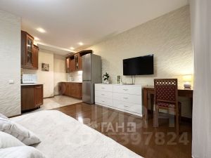 Светлая просторная квартира свободной планировки. При желании можно возвести перегородку и произвести зонирование. Французские окна в пол. На полу в ванной и коридоре - плитка. В комнате и на кухне - паркетная доска. Квартира оборудована всей необходимой мебелью и техникой. Большой шкаф в комнате, зеркальный встроенный шкаф в прихожей, телевизор, диван, кухонная мебель, холодильник Bosh. Вся мебель и техника остается новым хозяевам. Забирается только кровать.
