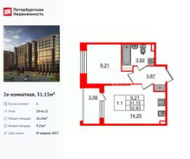 Удобная, классическая, функциональная европланировка, большая кухня-гостиная 14.25 м², вместительная прихожая 3.87 м². Общая площадь квартиры - 31.15 м², жилая 9.21 м², высота потолка 2.75 м.