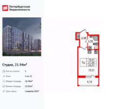 Удобная, классическая, функциональная европланировка, просторная прихожая 3.38 м². Общая площадь студии - 21.94 м², жилая 15.01 м², высота потолка 2.77 м.