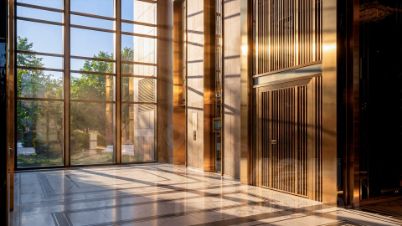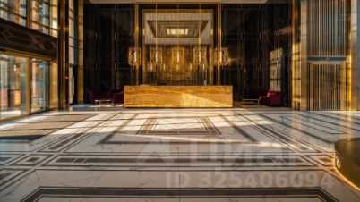 • Парадный холл со вторым светом (8 м) из глянцевого черного мрамора, травертина, оникса и золота.