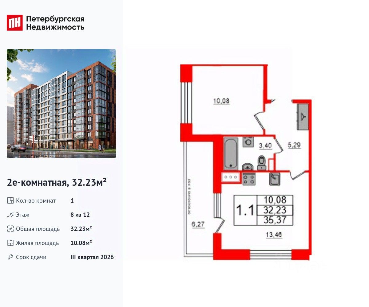 Удобная, классическая, функциональная европланировка, большая кухня-гостиная 13.46 м², просторная прихожая 5.29 м². Общая площадь квартиры - 32.23 м², жилая 10.08 м², высота потолка 2.77 м.