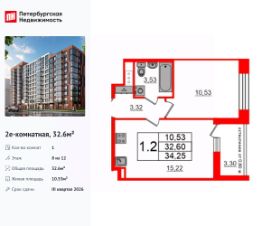 Удобная, классическая, функциональная европланировка, большая кухня-гостиная 15.22 м², вместительная прихожая 3.32 м². Общая площадь квартиры - 32.6 м², жилая 10.53 м², высота потолка 2.77 м.